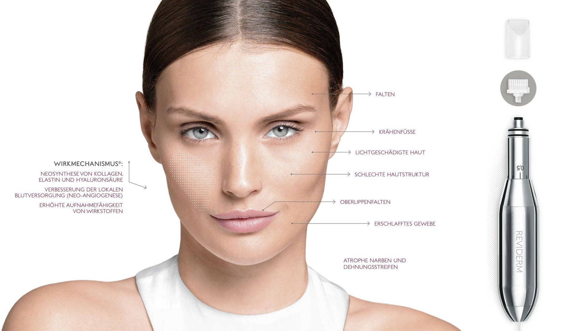 Micro-Needling gilt als Geheimwaffe zur Behandlung ästhetischer Hautprobleme. Durch seine einzigartige Wirkung ist es heutzutage aus der professionellen Dermo-Kosmetik nicht mehr wegzudenken. Mit seiner innovativen Nadelreihe setzt der REVIDERM SkinNeedler feinste Stichkanäle in die oberste Hautschicht. Dieser Impuls setzt eine Regenerationskaskade in Gang. Um sich so schnell wie möglich wieder zu regenerieren, wird daraufhin vermehrt Kollagen, Elastin und Hyaluronsäure in der Haut produziert, die essenziell für die Elastizität und Festigung des Bindegewebes verantwortlich sind.